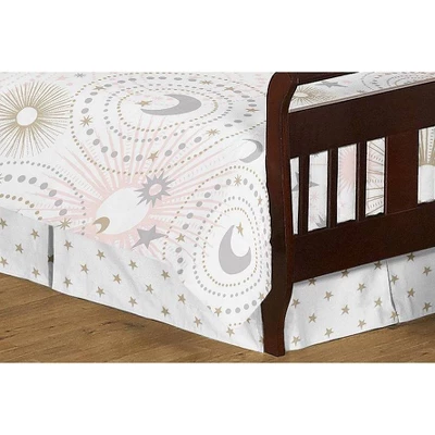 Pink and Gold Celestial 5 Piece Toddler Bedding set will help you create an incredible room for your child. This stylish designer bedding set uses a stars and moons celestial themed print and a coordinating metallic gold star print. This collection uses the stylish colors of blush pink, metallic gold, gray and white. The design uses brushed microfiber fabrics that are machine washable for easy care. This wonderful set will fit most standard cribs and toddler beds. Toddler Set Includes: Comforter, Pillow Sham, Fitted Sheet, Flat Sheet and Pillow Case.