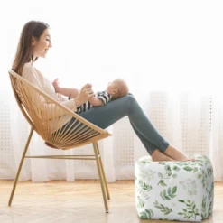 Sweet Jojo Designs Boy Girl Gender Neutral Unstuffed Fabric Ottoman Pouf Cover Decorative Storage Botanical Leaf Green And White Insert Not Included