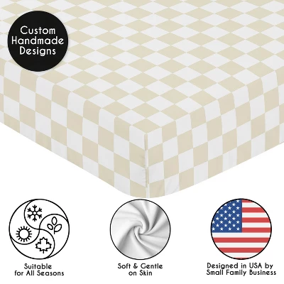 Gingham Checkered Plaid Collection Sweet Jojo Designs crib sheets are the ideal combination of unique designs, exclusive patterns, and classic colors to bring a stylish upgrade to your baby nursery or toddler bedroom and are sure to be your favorite newborn essential. This crib mattress sheet is designer curated and made with soft fabrics to complete your dream infant nursery. Our cribsheets feature a fully elastic bottom for a secure fit on most standard crib size and toddler beds. Our infant and toddler fitted crib sheets are lightweight and durable making the perfect sleeping environment for your bundle of joy. Don’t forget to purchase extras! It’s always good to have multiple baby bedding sheets to use in between laundry wash days and easily change in case of unexpected, late night messes. Or bring extra sheets from home when on vacation or traveling to grandparents house to give your tot a familiar place to rest their head no matter where you are. Pair your crib baby sheet with your favorite Sweet Jojo Designs collections and coordinate with our crib bedding sets, swaddle blankets, playmats and baby room decor accessories. A crib mattress sheet is essential for your baby’s comfort and ensuring a soft, breathable surface for restful sleep.This newborn crib sheet fits snugly over the mattress, providing a secure and smooth fit that reduces shifting and bunching. Adding a crib mattress sheet to your gift registry is a thoughtful way to prepare for your baby’s arrival, as it’s a practical and useful item every parent will need. And remember, you can never have too many baby sheets! Add a baby cribsheet to your list of must haves for your little one! This soft crib sheet is stretchy and comfortable to give your infant or toddler the perfect setting for a good night’s rest. It’s thoughtfully designed with elastic sewn around the entire bottom edge of the sheet for a secure fit on most standard sized cribs and toddler beds. Use one crib sheet in your newborns bed and have spares nearby to swap in between washes and to be prepared if an accident happens in the crib. The interior design of a nursery can be planned entirely around a single focal point like the crib sheet. It makes the perfect gift with one of Sweet Jojo Designs coordinating crib bed sets, changing pad covers, nursing pillow covers, nursery room decoration accessories and window treatments. Include one in your baby shower gift basket, gender reveal presents or add to your baby gift registry to ensure you have all you need to complete your Sweet Jojo Designs baby bed room look. SNUG FIT: Includes (1) Fitted Crib Sheet 52in. x 28in. x 8in. Our newborn standard crib sheets fit snugly, with premium elastic sewn around the entire bottom edge for a secure fit on most standard sized cribs and toddler beds, to reduce shifting and bunching. This brushed microfiber crib sheet features an exclusive trendy design of a bold and timeless classic retro style geometric checkerboard minimalist taupe check print and is gentle on delicate skin to foster a soothing sleep environment.