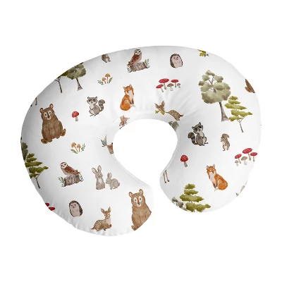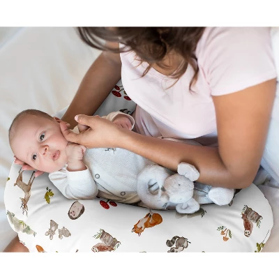 Watercolor Woodland Forest Animals Collection Sweet Jojo Designs breastfeeding pillow covers are easy to slip on and off your standard nursing pillow for washes as needed. Each features a hidden zipper and uses our exclusive stretchy jersey fabrics to coordinate with our matching decor accessories to give you a complete look for your nursery. Our versatile slipcovers fits most standard nursing pillows which help care takers hold your baby during feedings and will support your little one during supervised awake time as they grow and experience first year milestones. Our feeding and infant support pillowcases are made from soft durable fabrics. They also make the perfect baby shower gift for parents welcoming a new addition to their family. Please note: Nursing pillows are NOT intended for sleep. They should only be used while baby is awake and being supervised by an adult. COVER ONLY – PILLOW NOT INCLUDED. Sweet Jojo Designs creates various coordinating room accessories and decor for all of their children’s bedding and nursery bedding set collections (These items not included). 95% Rayon/5% Spandex Jersey Stretch Knit featuring a sage green, grey and brown watercolor woodland forest animals including bear, fox, hedgehog, deer and squirrel animal friends print.