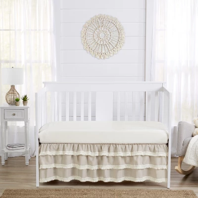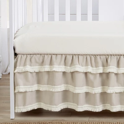 Boho Fringe Linen Collection 3 tier crib skirt or dust ruffle adds a finishing touch to your nursery.  Decorate with this stylish mix and match piece with a sheet yo ualredy own or coordinate with an existing Sweet Jojo Designs ensemble to get a complete bedding set look. Sweet Jojo Designs creates various coordinating room accessories and decor for all of their children’s bedding and nursery bedding set collections (These items not included). Linen Blend and Cotton – Solid Taupe Finished with a Knotted Tassel Macrame Fringe