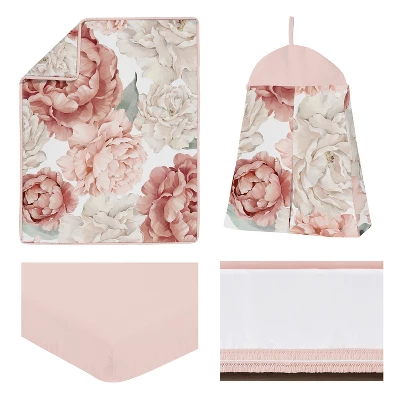 Pink and Ivory Peony Floral Garden Collection Crib Bedding Set has all that your little bundle of joy will need. Let the little one in your home settle down to sleep in this incredible nursery set. This wonderful set will fit most standard cribs. Crib set includes: Crib Comforter, Fitted Sheet, Crib Skirt (Dust Ruffle), and Diaper Stacker. Sweet Jojo Designs creates various coordinating room accessories and decor for all of their children’s bedding and nursery bedding set collections. It boasts an oversized bohemian watercolor peony flower print, a smaller version of the boho floral print, solid blush pink and white fabrics with tufted trim details. The nature influenced color palette of ivory, beige, sage green, delicate shades of pastel pinks and dusty rose will set your whimsical shabby chic nursery up in vintage boho style.