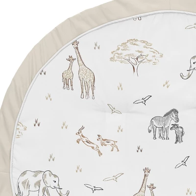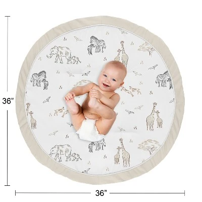 Serengeti Animals Collection Play Mats by Sweet Jojo Designs make tummy time and child development stylish and fun. Made with soft fabrics and fluffy fill, this multi-functional mat is small enough to take on the go. These adorable playmats will transform any room into the perfect play space. Great for vacations, playdates, beach outings, and everyday use at home. Always be aware of baby’s surroundings and keep an eye on baby while in use. Not intended for sleep. Sweet Jojo Designs creates various coordinating room accessories and decor for all of their children’s bedding and nursery bedding set collections (These items not included). Playmat is designed using a multicolor jungle safari animals print and finished with taupe piping and border