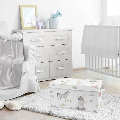 Farm Animals Collection Sweet Jojo Designs fabric toy bins are perfect for storing and organizing unruly clutter in any room or nursery. Each toy box features an attached flip lid to keep clutter out of sight, including dirty clothes to replace your clothing hampers and baskets. This kid friendly storage solution is collapsible to save space when not in use. Built-in reinforced handles for easy transport – Reinforced sturdy flip lid. Please note: actual print may vary on toybins featuring printed fabric. Sweet Jojo Designs creates various coordinating room accessories and decor for all of their children’s bedding and nursery bedding set collections (These items not included). Features a Multicolor Watercolor Farm Animals print