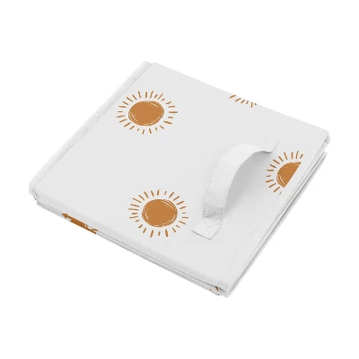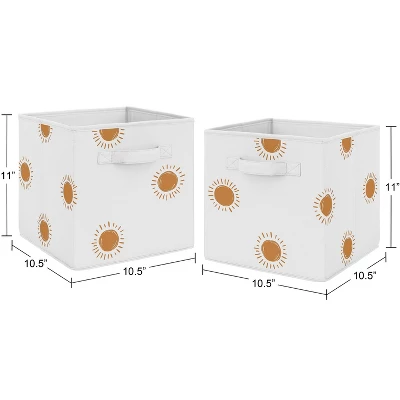 Boho Sun White and Pumpkin fabric storage bins by Sweet Jojo Designs offer a stylish yet functional storage solution. What a perfect way to transform your organizational system in any room. This set of two foldable storage cubes can be used in most standard cubby-hole shelving furniture in a classroom, as stand-alone bins in a playroom, or collapsed to save space when not in use in your little one’s bedroom. Please note: actual print may vary on bins featuring printed fabric. Sweet Jojo Designs creates various coordinating room accessories and decor for all of their children’s bedding and nursery bedding set collections (These items not included). Features a pumpkin orange and white boho sun print