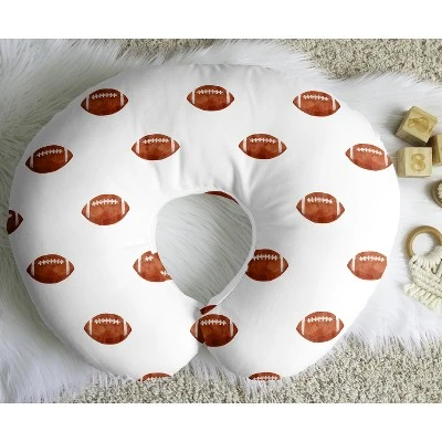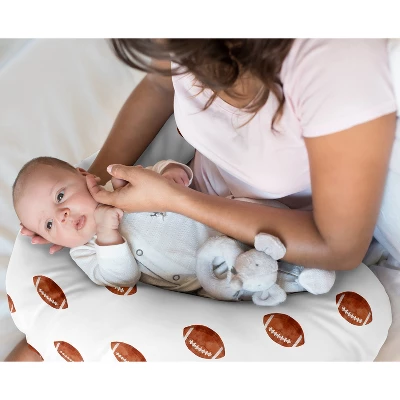 Watercolor Sports Theme Collection Sweet Jojo Designs breastfeeding pillow covers are easy to slip on and off your standard nursing pillow for washes as needed. Each features a hidden zipper and uses our exclusive stretchy jersey fabrics to coordinate with our matching decor accessories to give you a complete look for your nursery. Our versatile slipcovers fits most standard nursing pillows which help care takers hold your baby during feedings and will support your little one during supervised awake time as they grow and experience first year milestones. Our feeding and infant support pillowcases are made from soft durable fabrics. They also make the perfect baby shower gift for parents welcoming a new addition to their family. Please note: Nursing pillows are NOT intended for sleep. They should only be used while baby is awake and being supervised by an adult. COVER ONLY – PILLOW NOT INCLUDED. Sweet Jojo Designs creates various coordinating room accessories and decor for all of their children’s bedding and nursery bedding set collections (These items not included). 95% Rayon/5% Spandex Jersey Stretch Knit featuring a watercolor brown and white football print for sports theme vintage sport themed collection