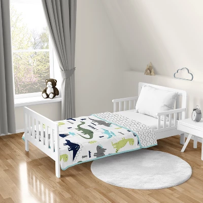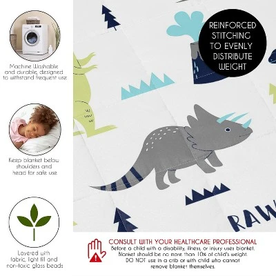 Mod Dinosaur Blue and Green Collection Sweet Jojo Designs helps improve and foster a comforting and safe sleep environment for your little one with our weighted blankets for kids. This weighted blanket cover was created to become your next bed time essential. Made with a brushed microfiber fabric and non-toxic glass beads, this kids weighted blanket 5 pounds has quilted grid squares to ensure an even distribution of weight across the body to reduce tossing and turning during the night and feel like a cozy hug! Lay the toddler weighted blanket to help induce a deep and restful slumber by stimulating important pressure points and relaxing the body to improve the physical development and mental development and concentration in the daily life of your growing child.  Use this as a sensory weighted blanket for kids who live with anxiety and/or Autism to provide a sense of security while lowering anxiety levels, reducing sensory overloads and promoting a sense of peace and safety. This portable, small  weighted blanket can be used all around the house or bring with you on-the-go.  Being smaller than an ordinary blanket, this doubles as a weighted blanket for adults! Concentrate the weight on your body with a weighted lap blanket while you read, meditate, watch television, lay on the couch, or mindlessly scrolling on your phone. Stains and spills are apparent in everyday life when children are involved, so having a machine washable weighted blanket is important. Durability and quality allows you to throw this sensory blanket into the wash and tumble dry low for repeat use. Choose the perfect weighted blanket for your child and watch them drift off into sweet, peaceful dreams! Featuring a layered design of light fill and evenly distributed non-toxic glass beads and an outer layer of exclusively designed brushed microfiber fabric of a navy blue and dark green modern dino and prehistoric grey and white bohemian volcano mod dinosaurs print and reverses to a white and gray geometric chevron print and finished with solid turquoise trim.
