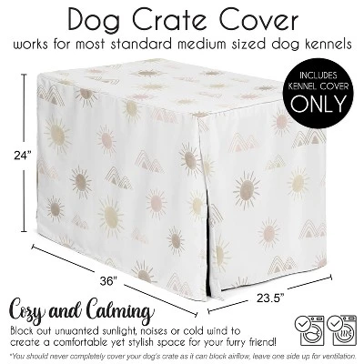 Desert Sun Collection decorative dog crate cover creates a comforting environment for your loving pet . This 36 inch dog crate cover works for most standard medium sized dog crates as well as 1, 2 or 3 door dog cages. Using a kennel cover provides a sense of privacy, security, and comfort for dogs, cats, and animals of all sizes! By helping to reduce light and outside stimuli, anxious behaviors in your furry friends like unwanted barking and chewing will be a thing of the past. Block out unwanted sunlight, noises or cold wind to create a space even you will want to crawl into! Decorate your dogs cage by simply placing the cover along the top of the kennel and use the hook and loop closure to allow the flaps to be lowered or raised as needed and secured in place. This dog kennel cover is the perfect addition for any pet parent to ensure a cozy and stylish home that your companion loves! This cover can be used in your home, office, bedroom, mud room, living room or family room to turn your dog crate into a thoughtful home decor piece. Many of our wire crate covers coordinate with Sweet Jojo Designs home decor items such as decorative pillows, rugs, window valances and curtains. Please Note: DOES NOT INCLUDE DOG CRATE OR MAT. Featuring an exclusive fabric of blush pink, gold, mauve and taupe bohemian mountains southwest nature outdoors minimalist geometric watercolor boho desert sun print.