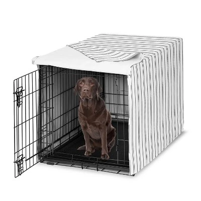 Stripe White and Grey Collection decorative dog crate cover creates a comforting environment for your loving pet . This 42 inch dog crate cover works for most standard medium and large sized dog crates as well as 1, 2 or 3 door dog cages. Using a kennel cover provides a sense of privacy, security, and comfort for dogs, cats, and animals of all sizes! By helping to reduce light and outside stimuli, anxious behaviors in your furry friends like unwanted barking and chewing will be a thing of the past. Block out unwanted sunlight, noises or cold wind to create a space even you will want to crawl into! Decorate your dogs cage by simply placing the cover along the top of the kennel and use the hook and loop closure to allow the flaps to be lowered or raised as needed and secured in place. This dog kennel cover is the perfect addition for any pet parent to ensure a cozy and stylish home that your companion loves! This cover can be used in your home, office, bedroom, mud room, living room or family room to turn your dog crate into a thoughtful home decor piece. Many of our wire crate covers coordinate with Sweet Jojo Designs home decor items such as decorative pillows, rugs, window valances and curtains. Please Note: DOES NOT INCLUDE DOG CRATE OR MAT. Featuring an exclusive fabric of grey and white stripe neutral pinstriped contemporary modern minimalist gray pinstripes.