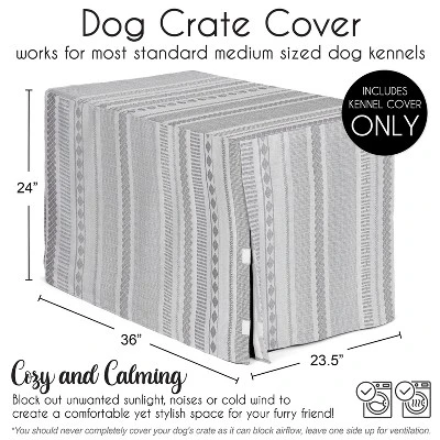 Grey Boho Tribal Jacquard Collection decorative dog crate cover creates a comforting environment for your loving pet . This 36 inch dog crate cover works for most standard medium sized dog crates as well as 1, 2 or 3 door dog cages. Using a kennel cover provides a sense of privacy, security, and comfort for dogs, cats, and animals of all sizes! By helping to reduce light and outside stimuli, anxious behaviors in your furry friends like unwanted barking and chewing will be a thing of the past. Block out unwanted sunlight, noises or cold wind to create a space even you will want to crawl into! Decorate your dogs cage by simply placing the cover along the top of the kennel and use the hook and loop closure to allow the flaps to be lowered or raised as needed and secured in place. This dog kennel cover is the perfect addition for any pet parent to ensure a cozy and stylish home that your companion loves! This cover can be used in your home, office, bedroom, mud room, living room or family room to turn your dog crate into a thoughtful home decor piece. Many of our wire crate covers coordinate with Sweet Jojo Designs home decor items such as decorative pillows, rugs, window valances and curtains. Please Note: DOES NOT INCLUDE DOG CRATE OR MAT. Featuring an exclusive fabric of a geometric textured bohemian woven jacquard in a unique minimalist inspired pattern