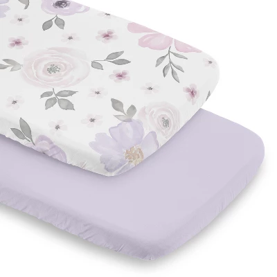 Watercolor Floral Lavender and Grey Collection Sweet Jojo Designs bassinet sheets offer a perfect blend of distinctive designs, exclusive patterns, and timeless colors to enhance the style of your baby nursery. They are bound to become your preferred essential for newborns. These fitted sheets for bassinets are carefully curated by designers and crafted with soft fabrics, providing the finishing touch to your dream infant nursery. The bassinet fitted sheet set is designed with a fully elastic bottom for a secure fit on most standard rectangle, oval, round, and hourglass-shaped bassinet mattresses. It’s important to note that these baby sheets are smaller than standard crib sheets and are not suitable for standard or mini crib mattresses. The infant and newborn cradle sheets are both lightweight and durable, creating an ideal sleeping environment for your little one. Choose Sweet Jojo Designs to complete your infant’s room and explore matching accessories like window treatments, hampers, baby bibs, and nursing pillow covers for a cohesive and aesthetically pleasing nursery decor. Pack of 2 Brushed Microfiber Sheets Set – (1) Lavender Purple, Blush Pink, Grey and White Bohemian Shabby Chic Farmhouse Boho Floral Watercolor Rose Flower Print paired with (1) Solid Color Lavender