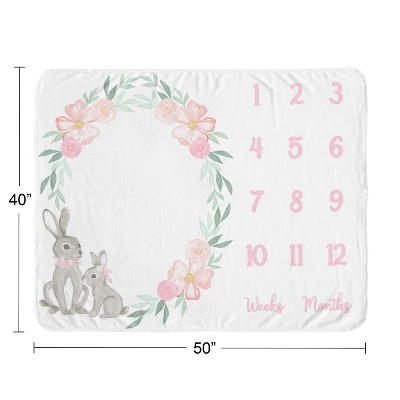 Bunny Floral Collection Sweet Jojo Designs 3 Piece Milestone Baby Blankets offer the perfect prop to help you capture monthly growth achievements. Each blanket features the numbers 1-12 and two soft frames that you can easily place over the numbers to correspond with your little one’s age in months and weeks. They make an adorable backdrop for all your baby’s photos as you celebrate each month of their first year or use as a security blanket, nursery receiving swaddle, tummy time floor playmat, or even a stroller or car seat cover. Add these lightweight blankets to any new parent list or give as the best keepsake baby shower gift. Snapshots taken with this soft infancy chart tracker will help you make the most precious social media posts to share on your wall or feed for friends, family, and followers to enjoy. No filter needed! Pair your blanket with your favorite Sweet Jojo Designs crib bedding sets, receiving security blankets, changing pad covers, crib sheets and other baby room decor accessories (These items not included). 100% plush minky fleece featuring blush pink, mint green and grey bunnies and flowers.