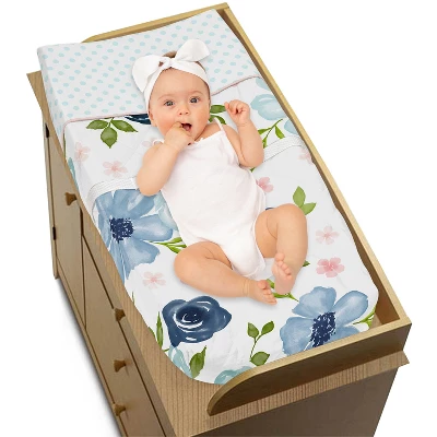 Watercolor Floral Navy Blue And Pink Collection Sweet Jojo Designs baby changing pad covers is the perfect nursery essential – it is created with soft fabrics in exclusive patterns and colors and finished with an embellished plush quilted diamond design to hold lining in place. Use a changing mat cover for extra protection and comfort for newborns and toddlers during outfit changes or changing diapers. And it’s always a good idea to buy extras so you can easily change it out when it’s time to wash. Sweet Jojo Designs offers coordinating crib bedding sets, receiving security blankets, nursing pillow covers and other baby room decor accessories (These items not included). Brushed Microfiber – Navy Blue and Blush Pink Watercolor Flower Floral with Blue and White Mini Polka Dot Print