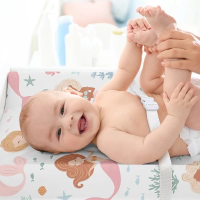 Pink and Blue Mermaids Collection Sweet Jojo Designs baby changing pad sheet covers is the perfect nursery essential. Use a changing mat cover sheet for extra protection and comfort for newborns and toddlers during outfit changes or changing diapers. And it’s always a good idea to buy extras so you can easily change it out when it’s time to wash. Sweet Jojo Designs offers coordinating crib bedding sets, receiving security blankets, nursing pillow covers and other baby room decor accessories (These items not included). This brushed microfiber diaper pad cover sheet features an exclusive design of a blush pink, teal blue, and orange under the sea underwater theme colorful fish seahorse starfish coral reef fairytale ocean mermaids print.