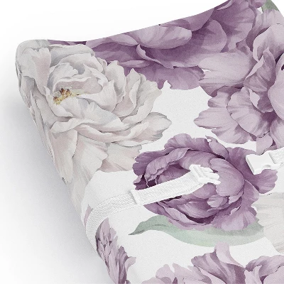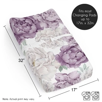 Peony Floral Garden Lavender Purple and Ivory Collection Sweet Jojo Designs baby changing pad sheet covers is the perfect nursery essential. Use a changing mat cover sheet for extra protection and comfort for newborns and toddlers during outfit changes or changing diapers. And it’s always a good idea to buy extras so you can easily change it out when it’s time to wash. Sweet Jojo Designs offers coordinating crib bedding sets, receiving security blankets, nursing pillow covers and other baby room decor accessories (These items not included). This brushed microfiber diaper pad cover sheet features an exclusive design of a lavender purple, light lilac violet, sage green, off white, ivory and cream boho shabby chic bohemian vintage garden watercolor flower nature elegant colorful pastel floral print.