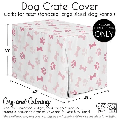Paw and Bone Blush Pink Collection decorative dog crate cover creates a comforting environment for your loving pet . This 42 inch dog crate cover works for most standard medium and large sized dog crates as well as 1, 2 or 3 door dog cages. Using a kennel cover provides a sense of privacy, security, and comfort for dogs, cats, and animals of all sizes! By helping to reduce light and outside stimuli, anxious behaviors in your furry friends like unwanted barking and chewing will be a thing of the past. Block out unwanted sunlight, noises or cold wind to create a space even you will want to crawl into! Decorate your dogs cage by simply placing the cover along the top of the kennel and use the hook and loop closure to allow the flaps to be lowered or raised as needed and secured in place. Made with polyester fabric, this dog kennel cover is the perfect addition for any pet parent to ensure a cozy and stylish home that your companion loves! This cover can be used in your home, office, bedroom, mud room, living room or family room to turn your dog crate into a thoughtful home decor piece. Many of our wire crate covers coordinate with Sweet Jojo Designs home decor items such as decorative pillows, rugs, window valances and curtains. Please Note: DOES NOT INCLUDE DOG CRATE OR MAT. CARTOON PUPPY BONE DESIGN: This girls medium/large dog crate cover boasts an exclusive design featuring shades of pink puppy bone modern neutral paw prints. Machine washable. Tumble dry low. DOG KENNEL COVER ONLY – DOG CAGE/CRATE/KENNEL NOT INCLUDED.